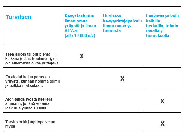 Jos tuntuu siltä, että laskutuspalvelua valitessasi et tiedä, kuinka vertailla eri palveluja keskenään, olet aivan oikeilla jäljillä. Kevytyrittäjä- ja laskutuspalveluja on tullut lähivuosina Suomen digitaivaalle useita ja niiden vertailu on haastavaa myös useita vuosia laskutuspalveluja käyttäneillekin.